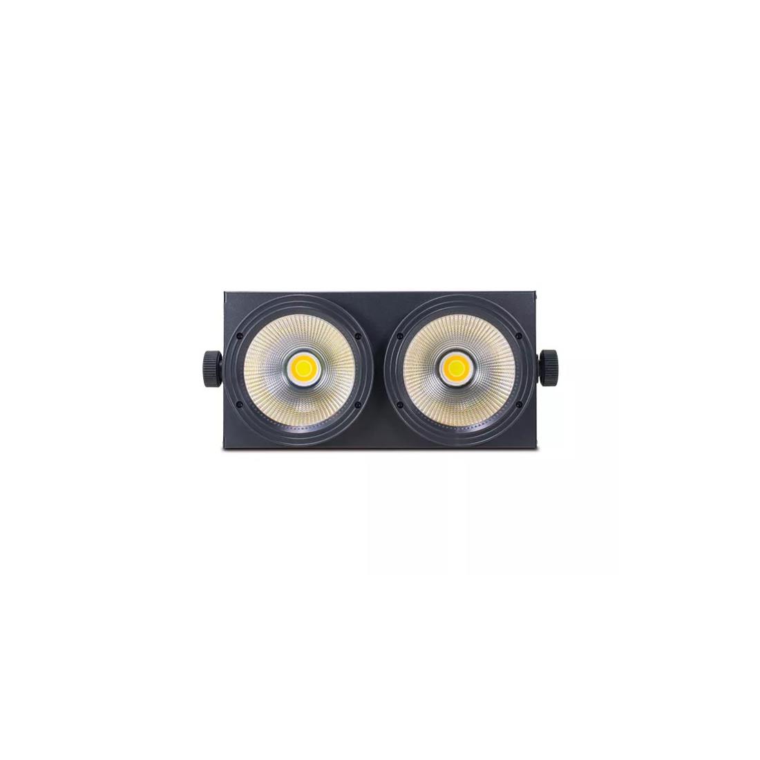 BLINDER 200 es una cegadora que incluye 2 LEDs COB de color blanco + blanco cálido de hasta 100W cada uno que permiten obtener una gran potencia lumínica, muy adecuada en espectáculos en vivo, aplicaciones de touring, etc. Dispone una pantalla con toda la información y botones para navegar a través de menús, seleccionando parámetros tales como velocidad de estrobo funcionando en modo automático, programas internos o sensibilidad de audio. El bastidor permite la orientación en ambos ejes, pudiendo variar el ángulo de emisión y redirigir los focos en ángulos distintos del perpendicular habitual. El dispositivo incluye el modo DMX (4 y 8 canales) con control individual de cada LED, selección de temperatura de color y modo de uso o estrobo general