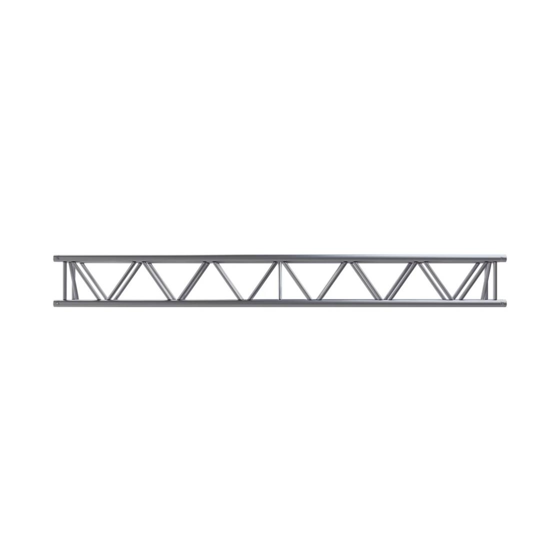 Tramo de estructura truss rectangular de aluminio de 35 cm de alto y 26 cm de ancho, fabricado con tubo principal de 50 mm de diámetro y 4 mm de espesor, y tubo auxiliar de 25 mm de diámetro y 3 mm de espesor. Especialmente indicado para montajes con altas capacidades de carga. Sistema de conexión cónica CBC50. Está disponible en tramos de 0,5 m, 1 m, 2 m, y 3 m, y en color plateado o negro. Incluye 4 dobles conos, 4 pasadores, y 4 clips de seguridad 'R'. Compatible SERIE F