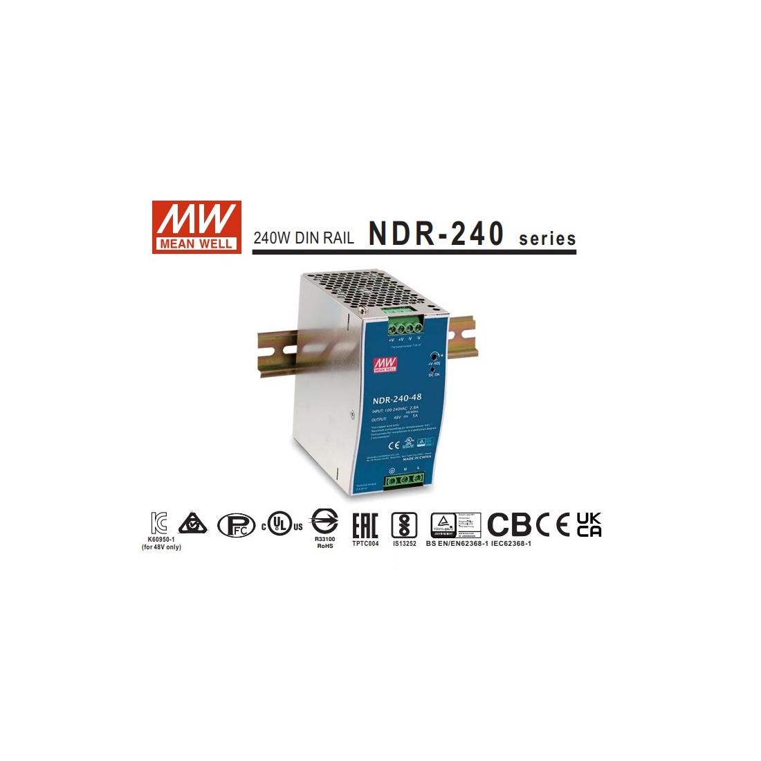 Mean Well Fuente carril DIN 48v 5A serie NDR.Rango de entrada universal 90-264Vca 47-63Hz.