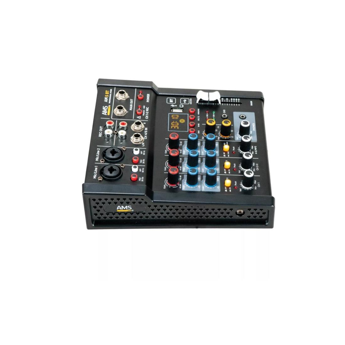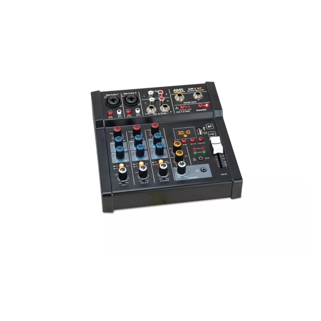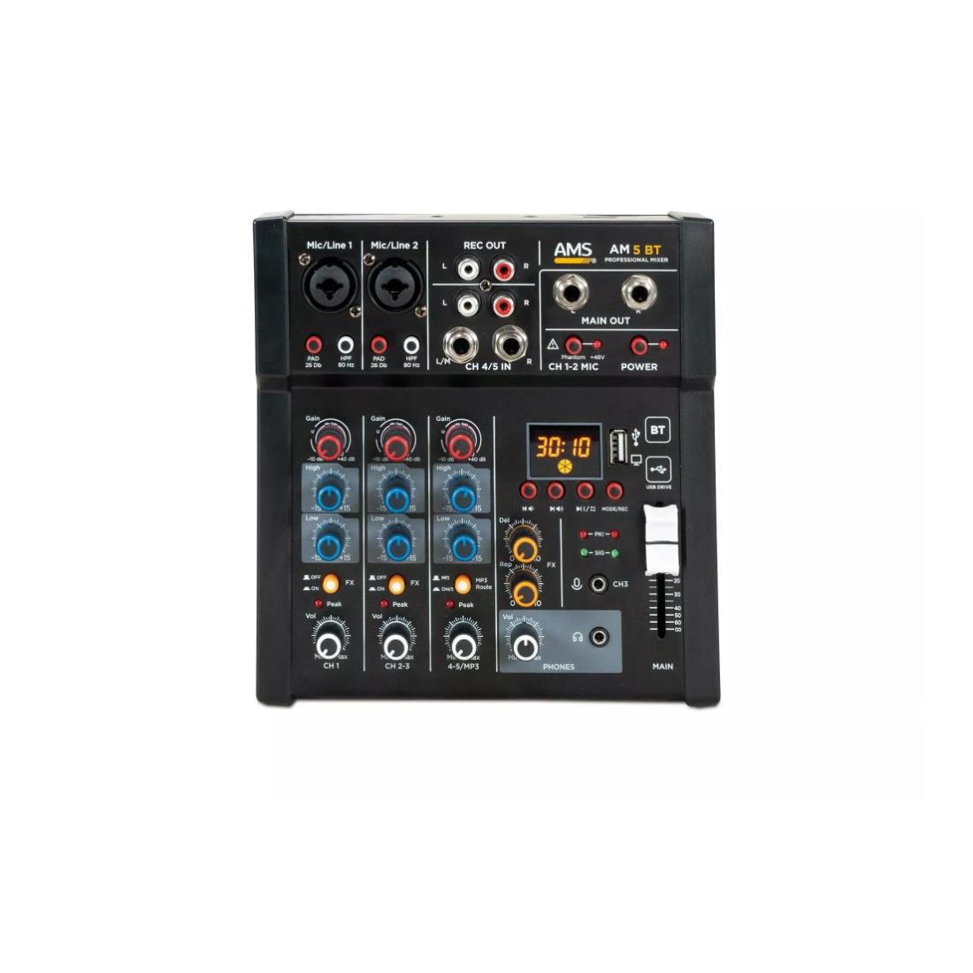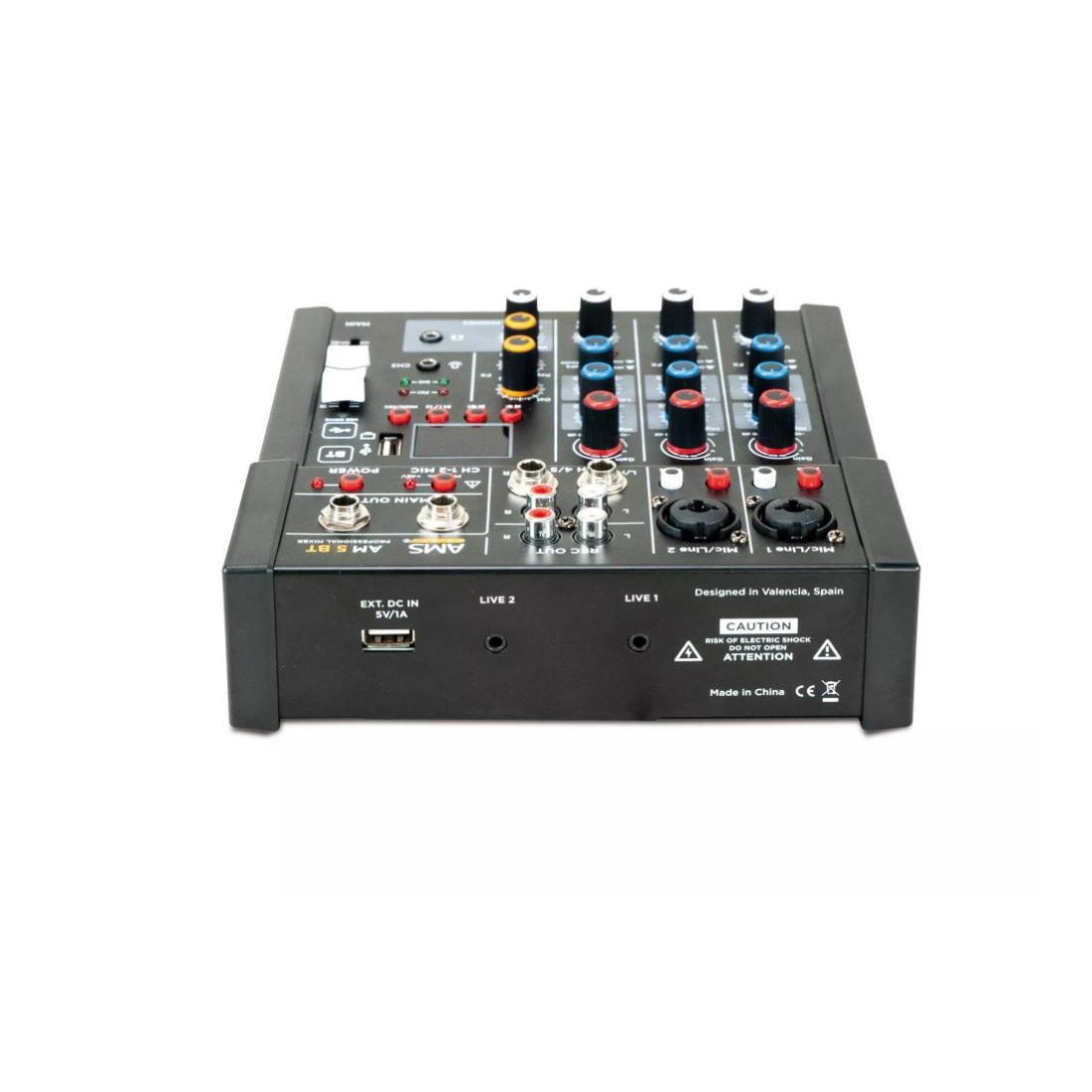 El AM 5 BT cuenta con un reproductor de archivos de audio con reproductor/grabador USB, funcionalidad Bluetooth, efecto ECHO, 2 controles de tono en canales mono y estéreo y salida de auriculares. Su función de grabación aprovecha su puerto USB, que actúa como tarjeta de sonido.