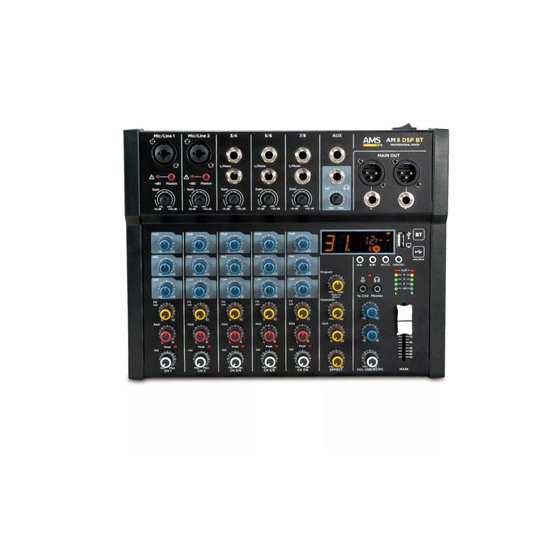 AM 8 DSP BT es un mezclador de audio con 2 canales mono MIC/LINE y 3 canales estéreo. Sus canales de entrada MIC/LINE incorporan alimentación Phantom para micrófonos de condensador. Cuenta con reproductor de archivos de audio a través de puerto USB y función grabación y Bluetooth, DSP con 24 efectos integrados, 3 controles de tono por canal y salida de auriculares. Función Tarjeta sonido USB.