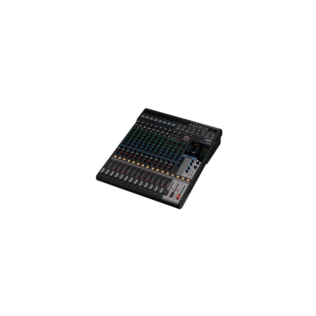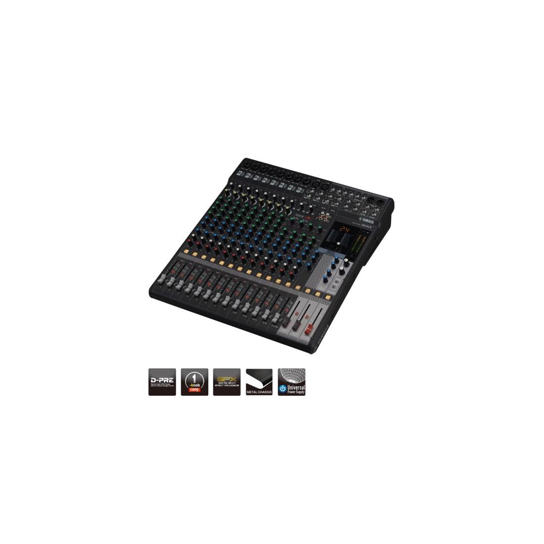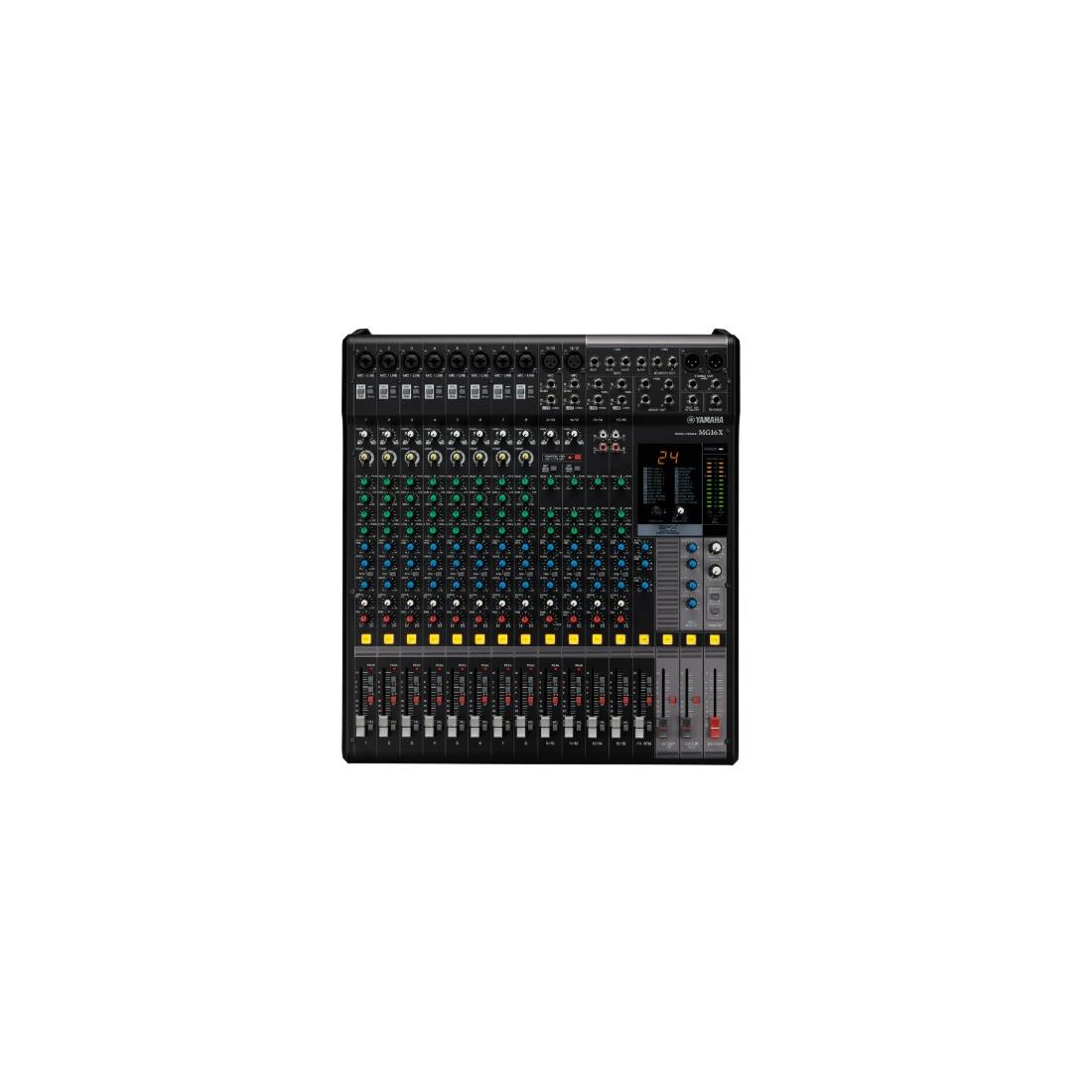 Consola de mezcla de 16 canales: Máx. 10 micrófonos / 16 entradas de línea (8 mono + 4 estéreo) / 4 buses GROUP + 1 bus estéreo / 4 AUX (incl. FX)