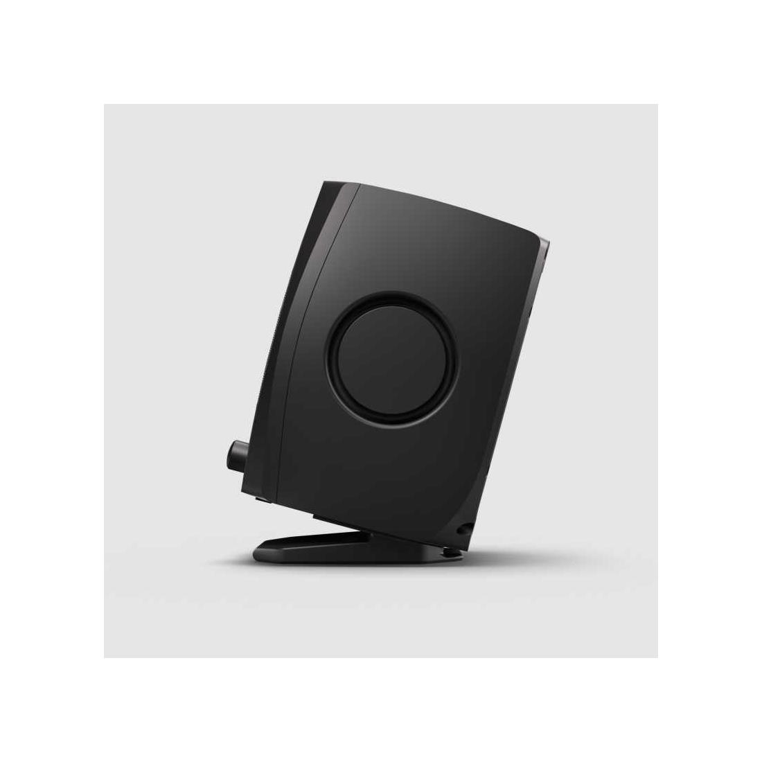 El altavoz izquierdo del D3V cuenta con interruptores que permiten ajustar la acústica según la ubicación de los monitores, y su panel frontal integra una salida para auriculares y un botón de volumen que también controla la selección de entrada de audio, muteo y otras funciones.