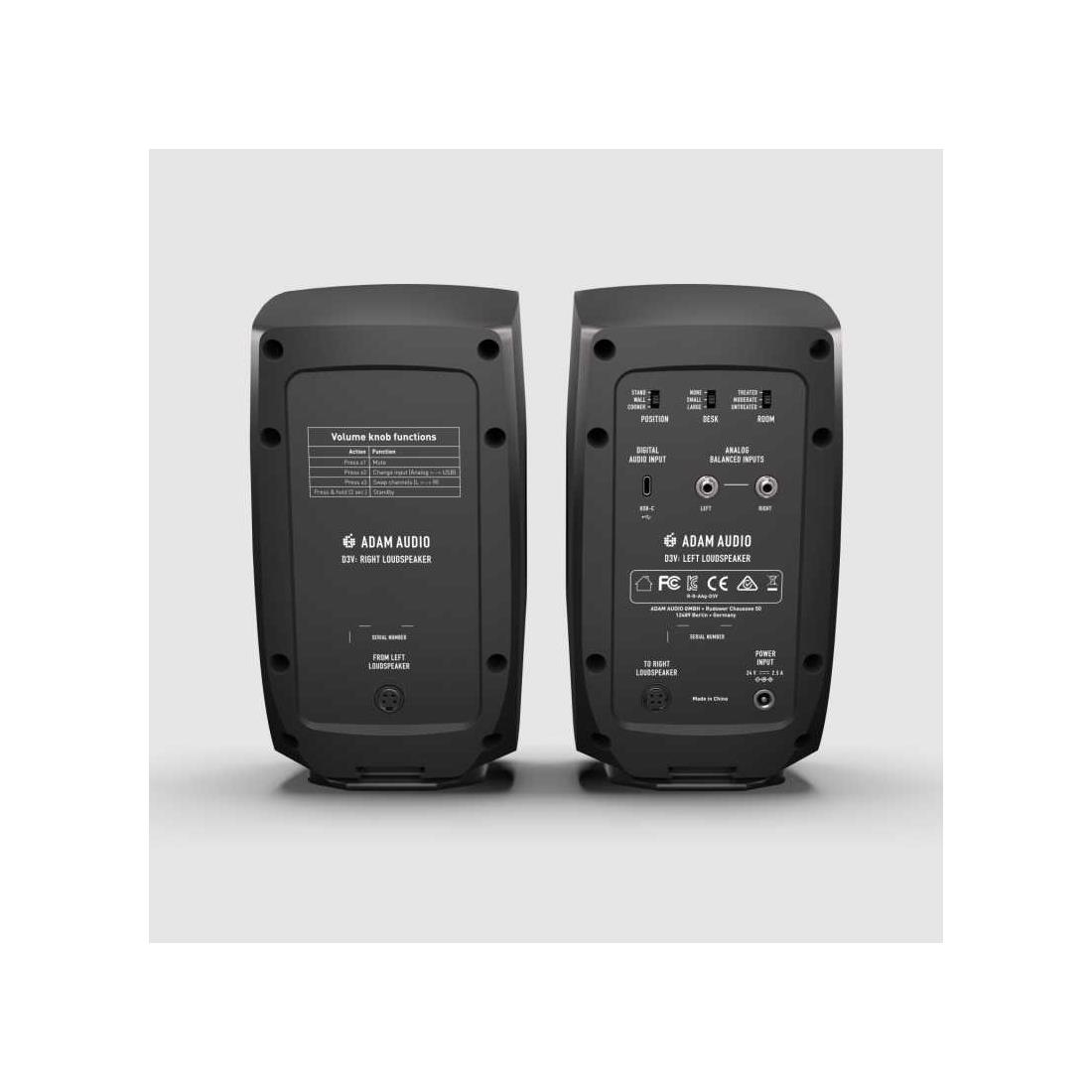 D3V prioriza la funcionalidad y comodidad, con salida de auriculares en el panel frontal y soportes desmontables inclinados para un posicionamiento óptimo. Su carcasa, fabricada en policarbonato ABS moldeado por inyección, reduce vibraciones y resonancias no deseadas, mientras que su diseño redondeado minimiza la difracción en frecuencias altas, reflejando el legado de diseño industrial de ADAM Audio.