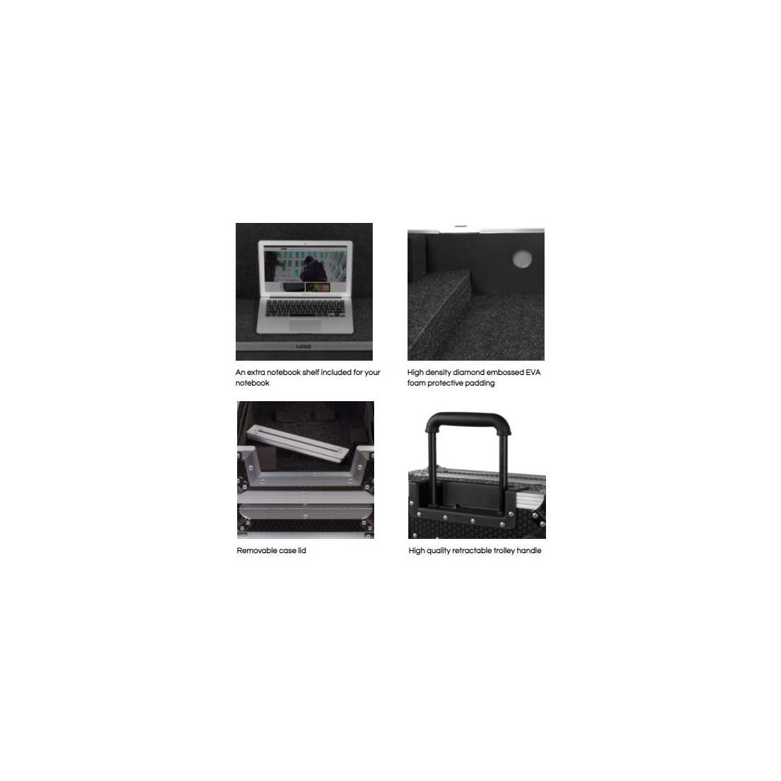 U91014BL3 - Ultimate Flight Case Multi Format XXL MK3 en acabado Black Plus - adecuado para transportar de forma segura diferentes tipos de equipo (con bandeja para ordenador) Peso 11,50 kg - Dimensiones exteriores 78 x 49 x 20 cm. Puede llevar comodamente: