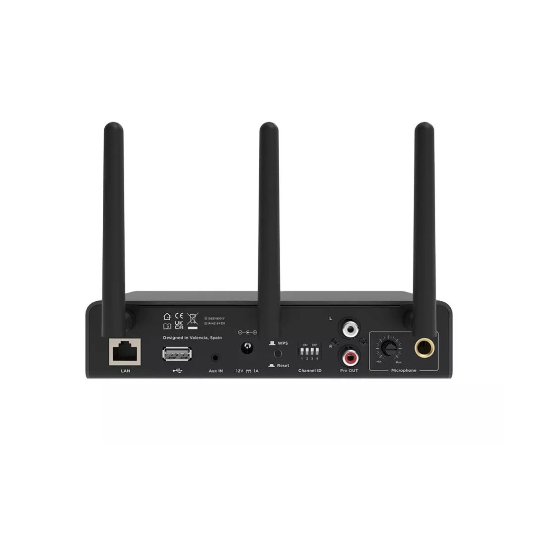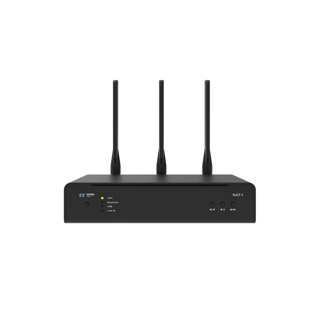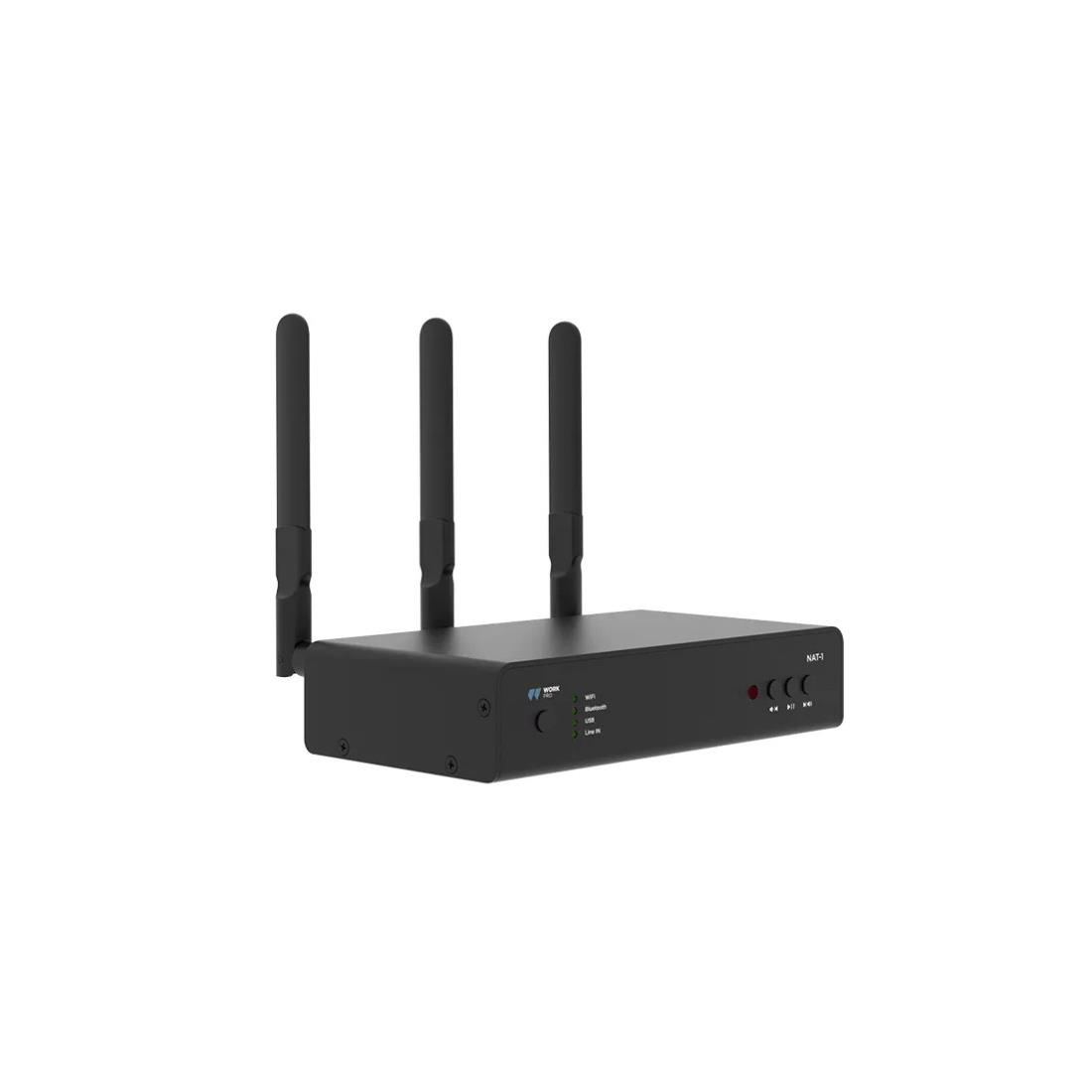 NAT 1 es un emisor broadcast inalámbrico multimedia que ofrece un gran número de posibilidades de transmisión de audio. Incorpora puerto USB para la transmisión de ficheros MP3, Entrada AUX analógica, Puerto LAN para una read dedicada, funcionalidad bluetooth y wifi. Además, incorpora una entrada de micrófono con ajuste de ganancia, así como salida de previo para la conexión a dispositivos auxiliares como mezcladores.