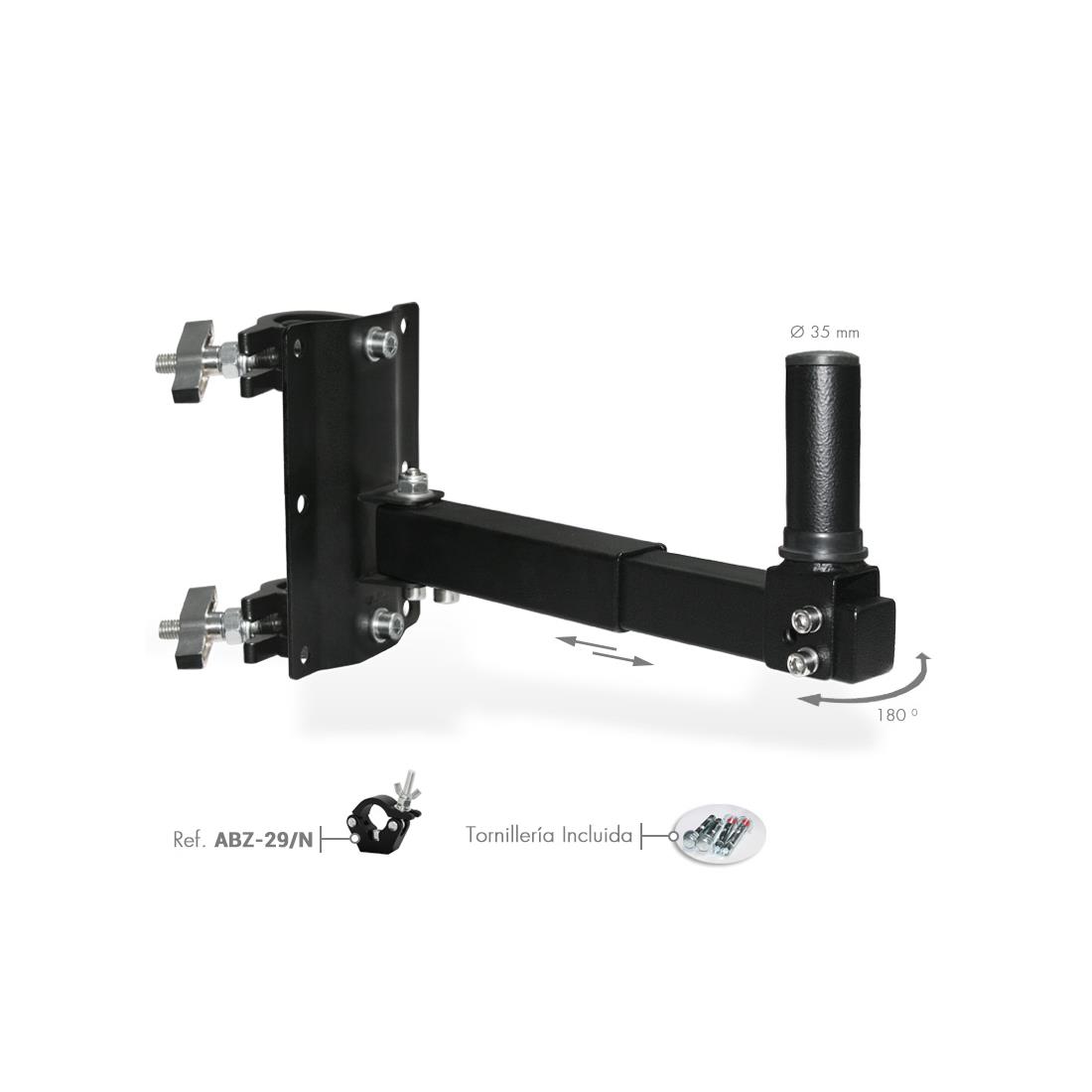 Este práctico soporte de altavoz está provisto de dos abrazaderas de aluminio con acabado en negro, ref. ABZ-29/N que garantizan una fijación fuerte y segura a tubos con diámetros de 45 a 52 mm, tales como trusses, calles, etc. Es la solución perfecta para montajes donde no se puede fijar el soporte en la pared o no se quiere utilizar un trípode convencional por el espacio que este ocupa.