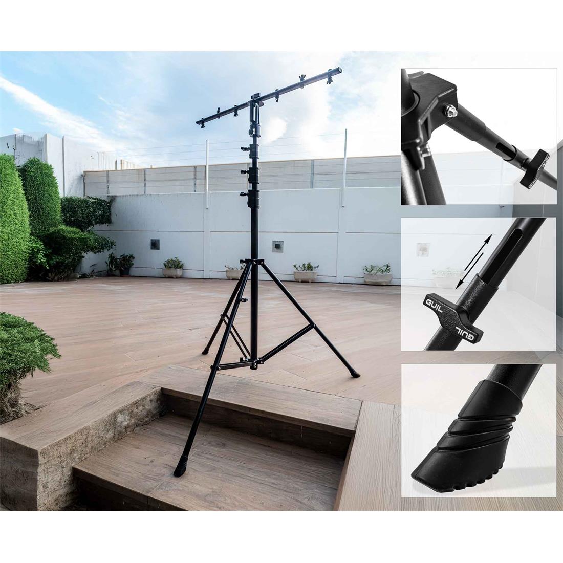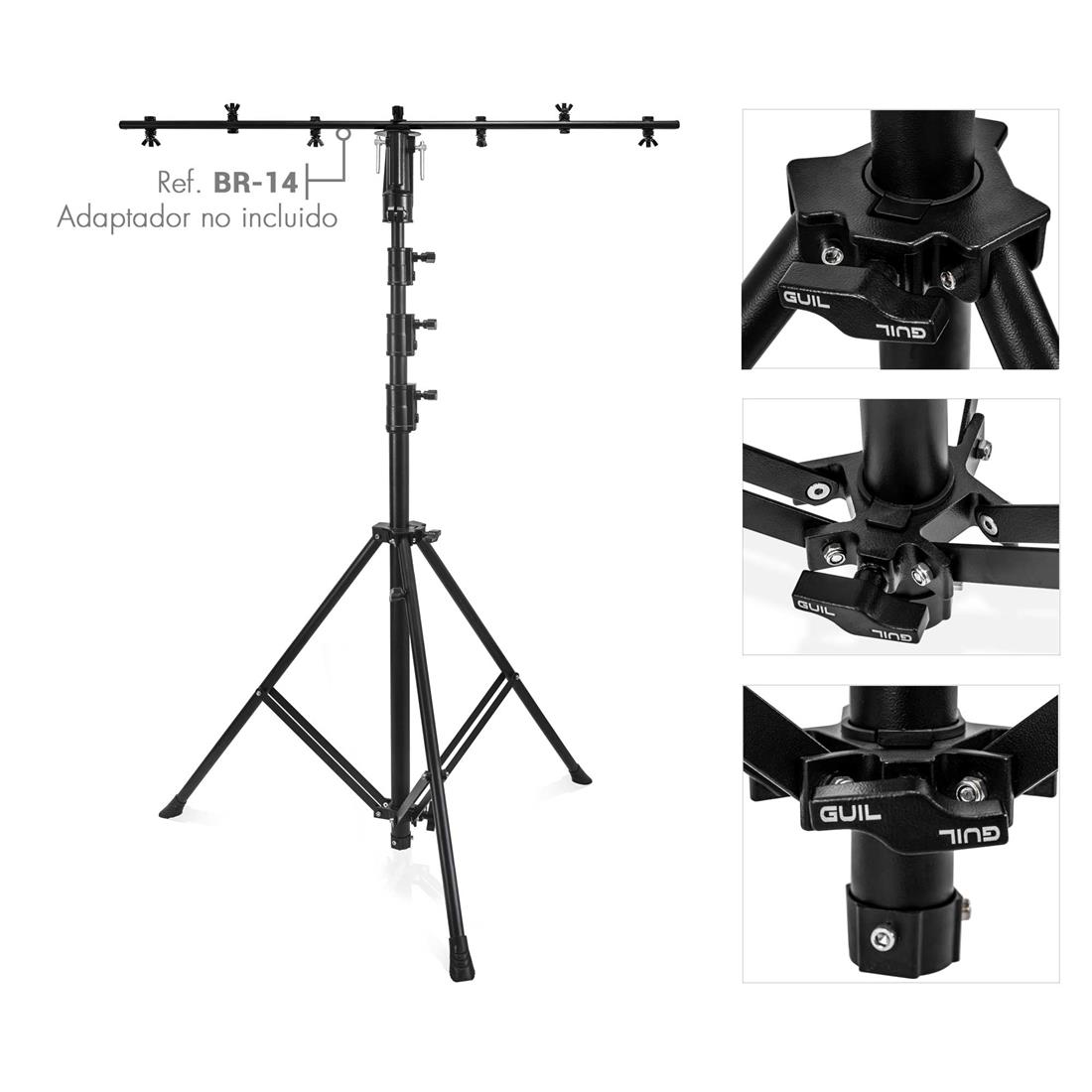 Nuestro pie de foco está provisto de una base plegable con doble pletina de refuerzo que garantiza una máxima estabilidad y durabilidad. La estructura, fabricada en acero con acabado en pintura negra antirrayadura, está provista de tacos antideslizantes para una perfecta adherencia al suelo.
