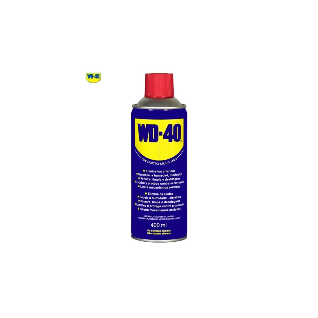 Spray de aceite lubricante multiusos WD40 de 400ml. Ideal para cerraduras o mecanismos atascados por el oxido o por el frío.Lubrica piezas en movimiento como bisagras, rodamientos, cadenas y engranajes.Elimina cualquier tipo de cera, alquitrán, grasa o adhesivos.Protege contra el óxido y la corrosión.